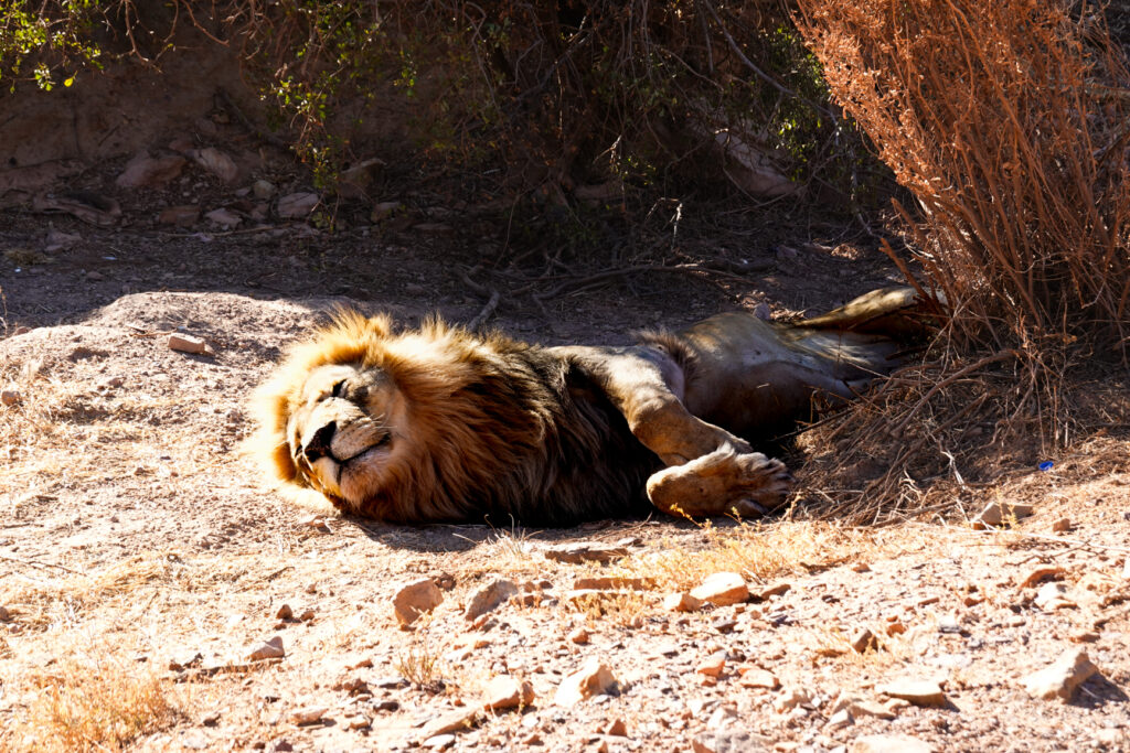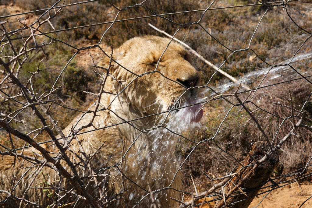 A bit closer to the preserve we see some giraffes and then we arrive at “The Sanctuary”, where there are a few lions. The first one we see is very large, although he is only about two years old. The keeper gets playful with him with a water hose which the lion loves…