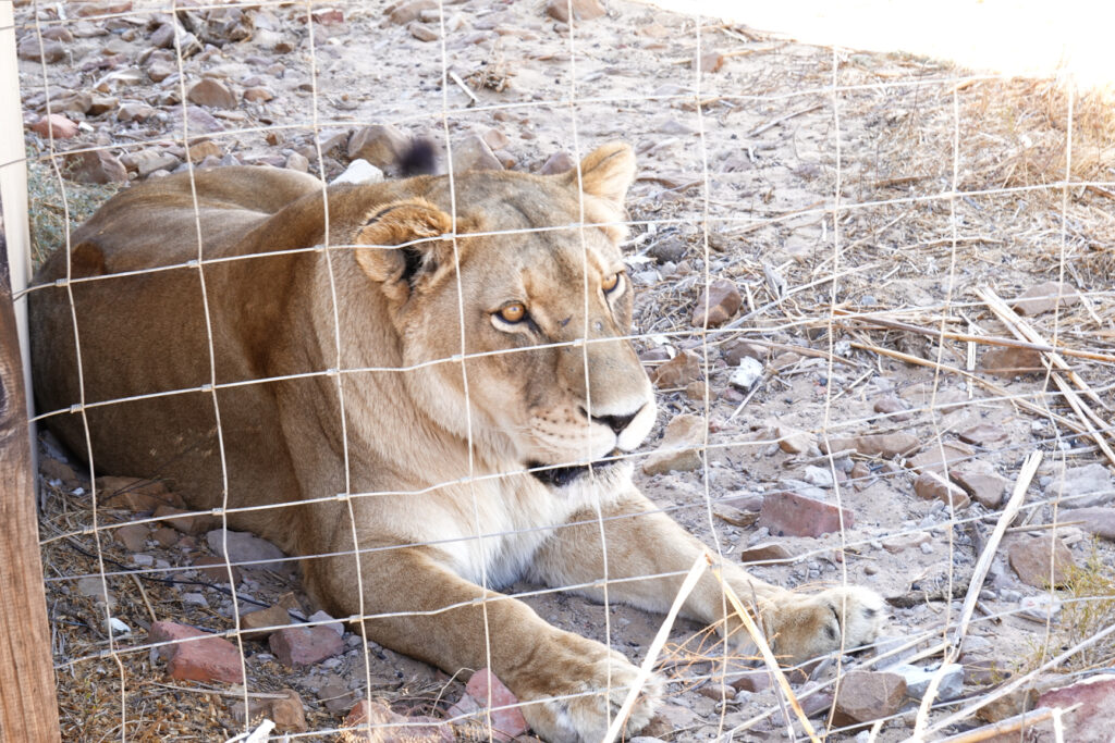 Then we head over to where an adult male (“Mufasa”) is and an adult female. It is a hot day so the male doesn’t come out of the shelter though we can hear his breathing which definitely communicates this is a big cat. The female comes over to “pose” for a few pics for us. We then head over to the main building where we first have to “sign our lives away” for lability purposes!