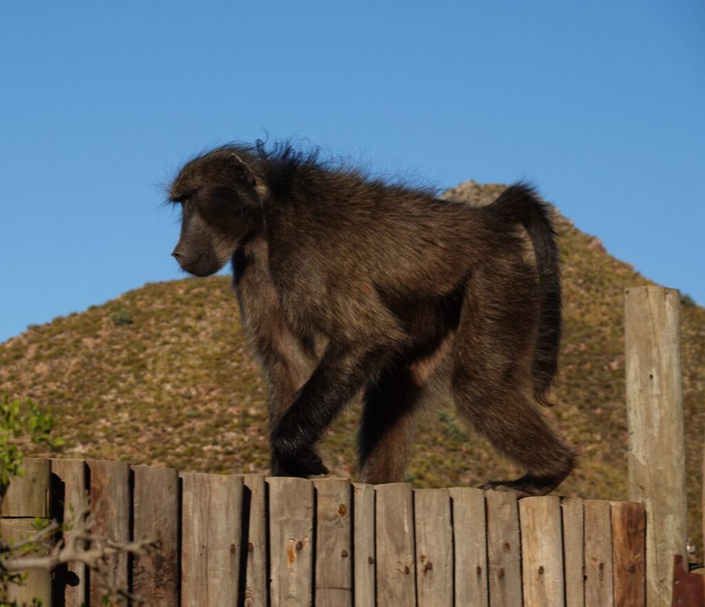 After the lions we all think we are heading back to the welcome center as we can see the sun beginning to get low in the sky but instead we take a beautiful scenic drive many miles deeper into the preserve. We end up at an oasis where there is a building set up for us to rest, and have another glass of wine, use the rest room and talk about what we have seen so far! The baboons are everywhere here at the Oasis and give us quite a show hopping from hut to hut.