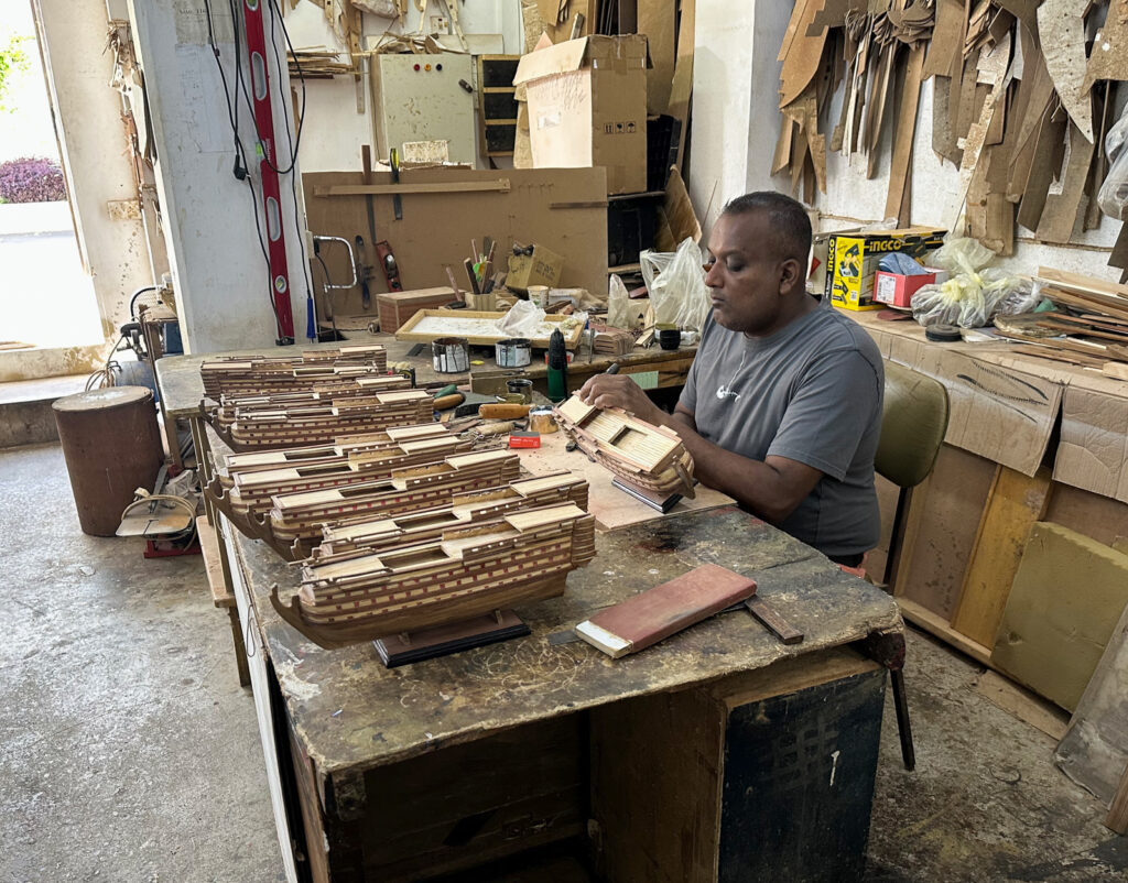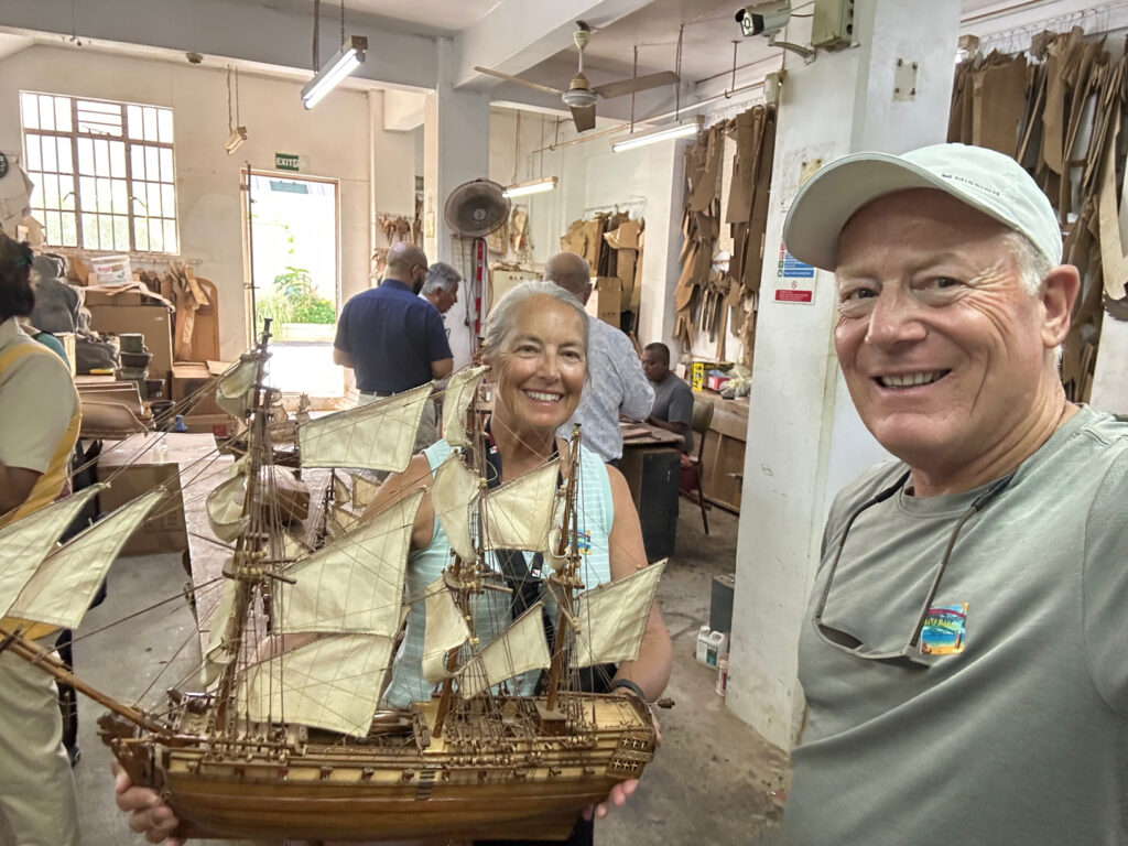 Our first stop is at a market. When Karen first tells us this we both have the same thoughts; another tourist trap to get us to spend money in a market, but it actually ends up being a great stop. We are guided into the back of a shop which is set up as a workshop for miniature/model ship building. Here we can watch the process of the building from a woman sewing the sails to another one gluing wooden pieces together, to another burning pieces. It was fascinating to watch. From the back we were then escorted into the actual shop where the rest of the trinkets, jewelry and other touristy items are sold. We didn’t find anything for us to purchase but other passengers did.