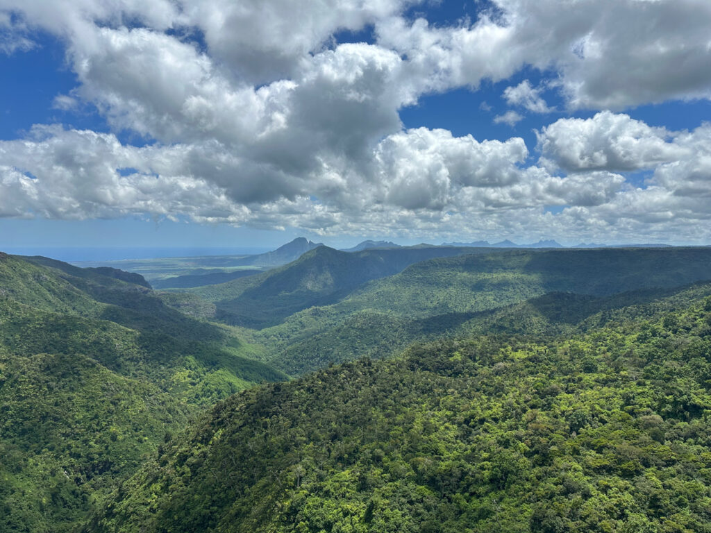 As we drive away from this area we stop at a lookout along the way to view the famous Black River Gorges National Park. With the blue sky, green mountains and waterfall it is beautiful!