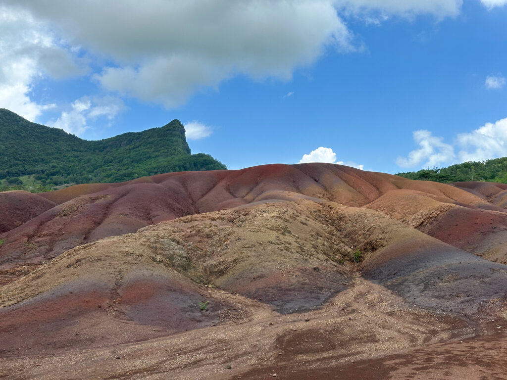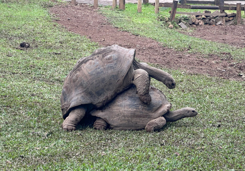 Departing the Falls we take the short ride to Seven Colored Earth Geopark. The Seven Coloured Earths are a geological formation and prominent tourist attraction found in the Chamarel plain of the Rivière Noire District in south-western Mauritius. It is a relatively small area of sand dunes comprising the sand of seven distinct colours. It is interesting but not as impressive as we thought it would be. More interesting is the huge tortoise refuge. Some of these tortoises are hundreds of years old! When we got there one was on top of another and it was clear they were mating! The one on top (most likely the male) was making loud grunting sounds and the whole thing was a riot to watch!