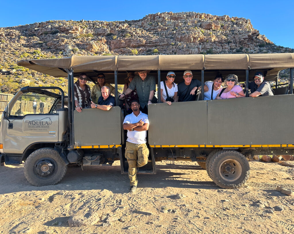 The tour includes a basic South African meal and a glass of Cape Town wine. We are all pretty anxious to get into the jeep and begin our actual safari, because we are so late. The tour operator assures us they will not skimp on time at all and will give us everything we need on to explore the preserve. In hindsight they were true to their word and the adventure turns out even better than what we had paid for and expected. The late afternoon actually nearing dusk is when we are out on the safari and they said there is always more wildlife this time of the day. When we booked the tour originally a late afternoon departure had a premium price on it, which was much more expensive but since our tour had been delayed so much in the spirit of customer service they didn’t charge us extra and gave us the premium tour. Everything worked out in spite of the disembarkation disaster.