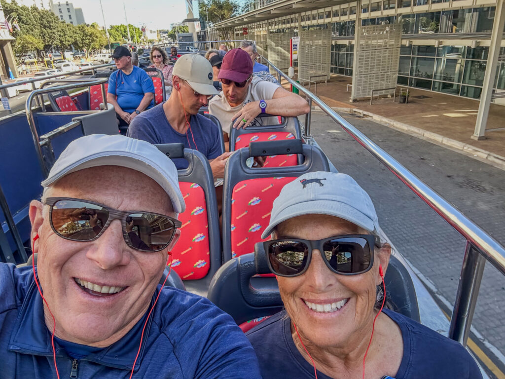 There are so many things we could do today but last night we decided to get tickets for the HOHO (Hop on-Hop Off ) bus that include’s tickets for the cable car up Table Mountain. Our DSRV friends from Ontario, CA, Gordon and Debbie Moon, highly recommended this and then many people that were here last year said also Table Mountain is not to be missed. Joanne saw that some people are meeting in Crown Grill then heading out to the pick up point for the bus so we head there directly after breakfast at 8:00am. No one there! Though we are a few minutes early so we wait for a bit of time. Eventually we say forget it and depart on our own. The walk to Victoria Market, to pick up the bus, is an easy 15 minute walk and we meet up with our friends Heather and Kevin from Penticton, CA along the way. They plan to do the blue bus and we plan on the red bus but we meet in the same place to start off so we walk together and talk about what we each did yesterday.