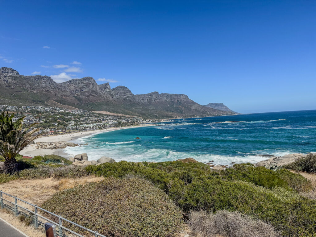 Back on the bus with the “Seven Sisters” mountains and adjacent Table Mountain behind us as we head to the beach area…The beaches are spectacular….