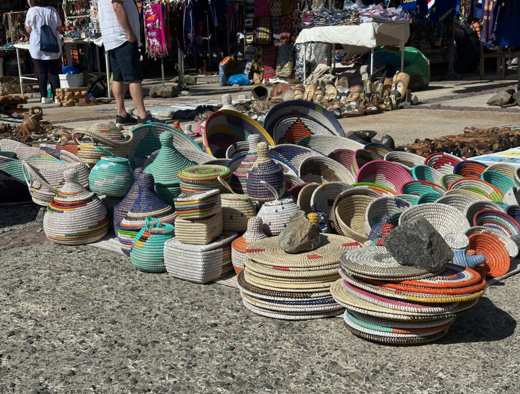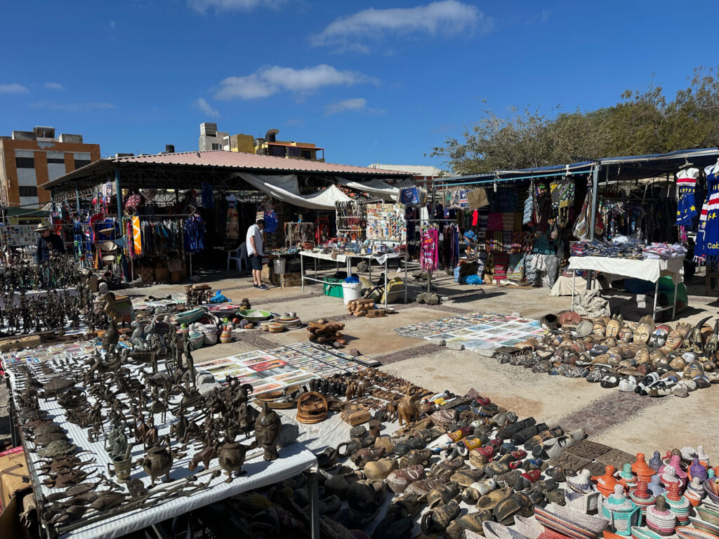 Joanne had done some necessary research and also spoke to some people that have done this port before and discovered there really isn’t much to do here except wander around. We had a leisurely breakfast onboard as we did not have an excursion to catch. Once we exit the ship we head to the right into the center of town. We are always cognizant of the people around us when in port and we were even more prudent of this action in Cape Verde. The port area gave us some concern so we make sure back packs, cameras, phones… are not as visible or accessible as we walk for the day. There are some markets and cool sculptures to take photo’s of. The ocean / beaches / water is gorgeous blue. There are a lot of sailboats and fishing boats in the nearby marina. We find the markets; one a fish market which held no interest for us as we can’t bring it onboard; and a craft / clothing / souvenir market.